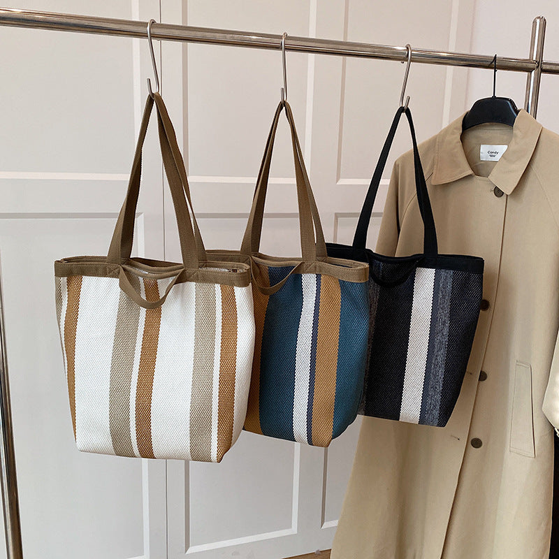 2025 New Stripe Contrast Handheld Women's Bag Large Capacity Fashion Commuter Versatile Shoulder Bag Knitted Fabric Korean Edition Tote Bag