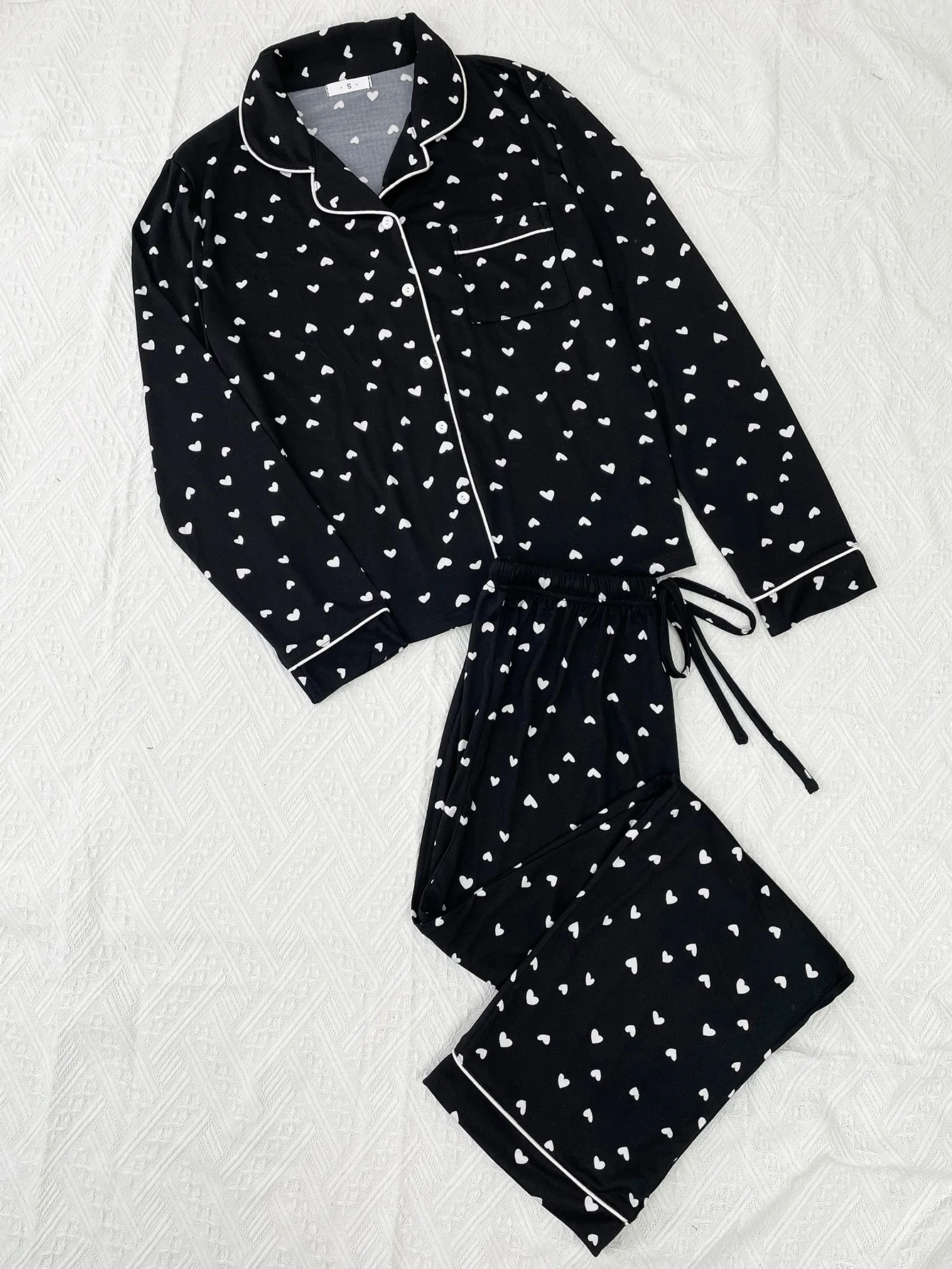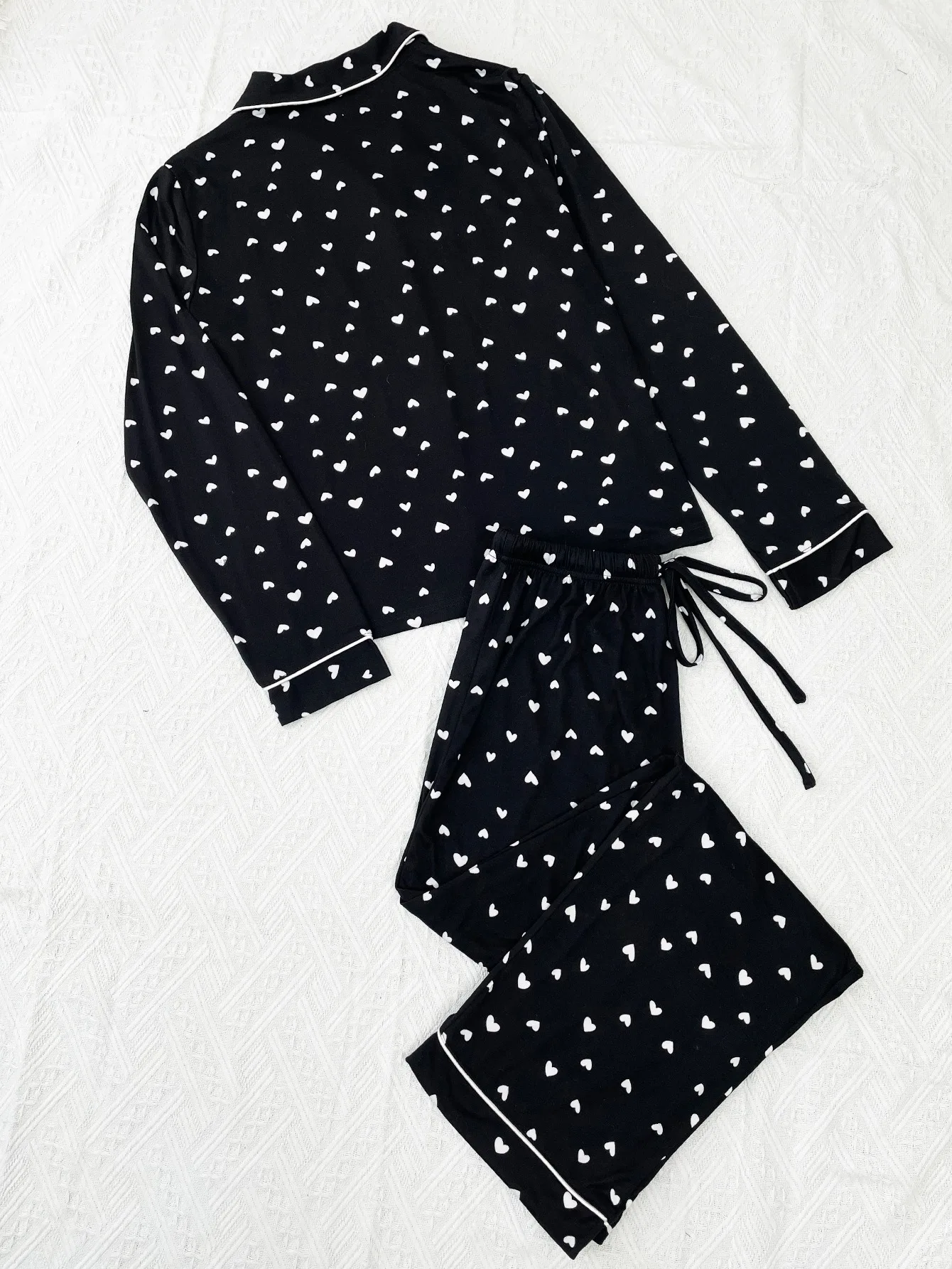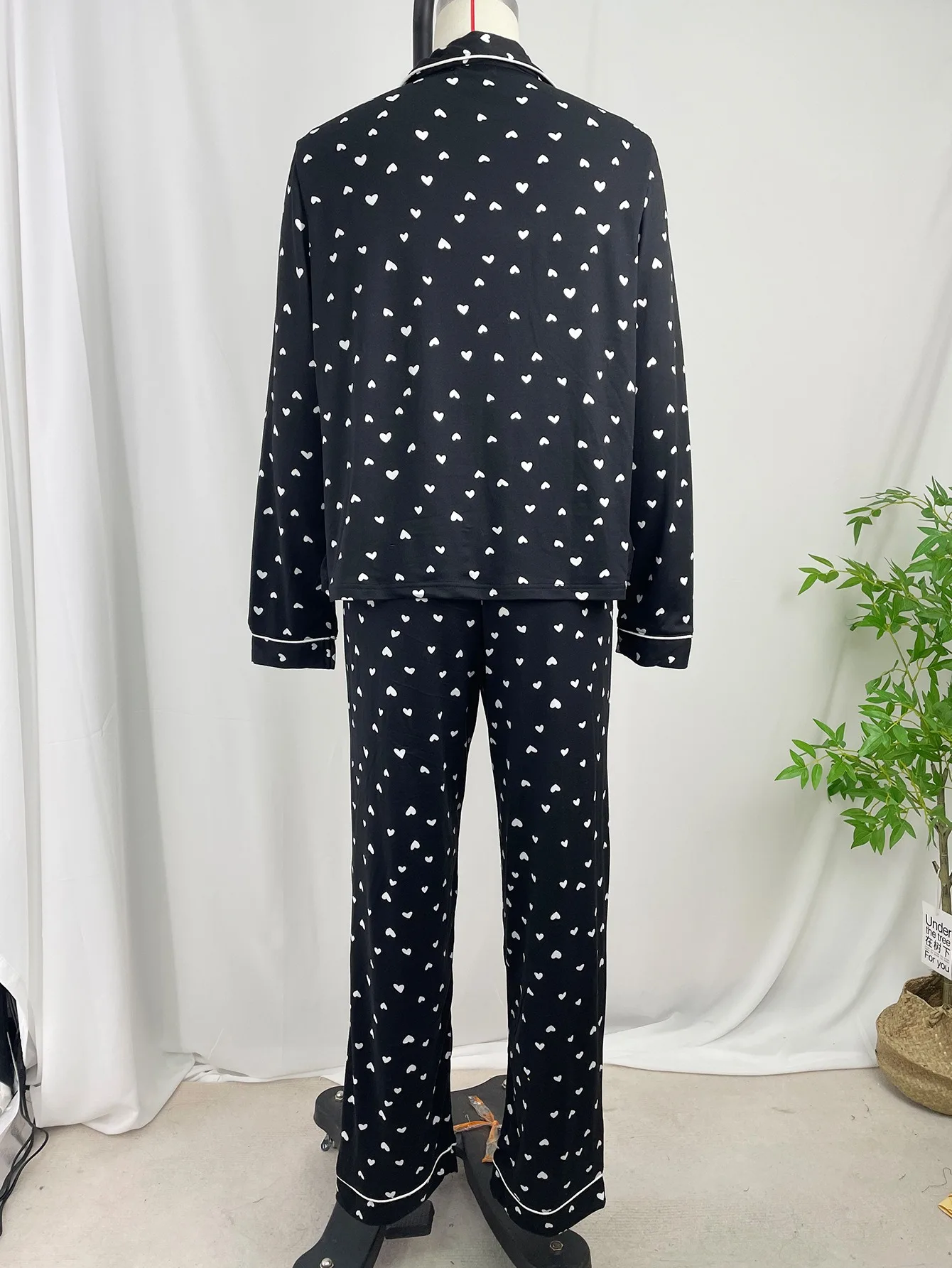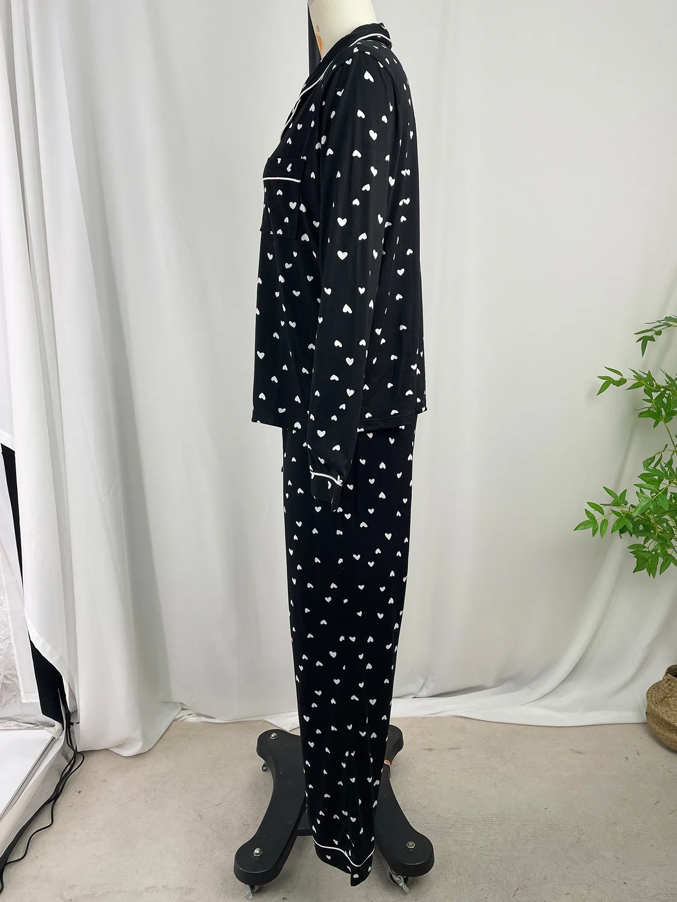 Heart Print Women Pajamas Set Long Sleeve Front Button Tops & Full-length Pants Female 2 Pcs Notched Collor Sleepwear Nightwear