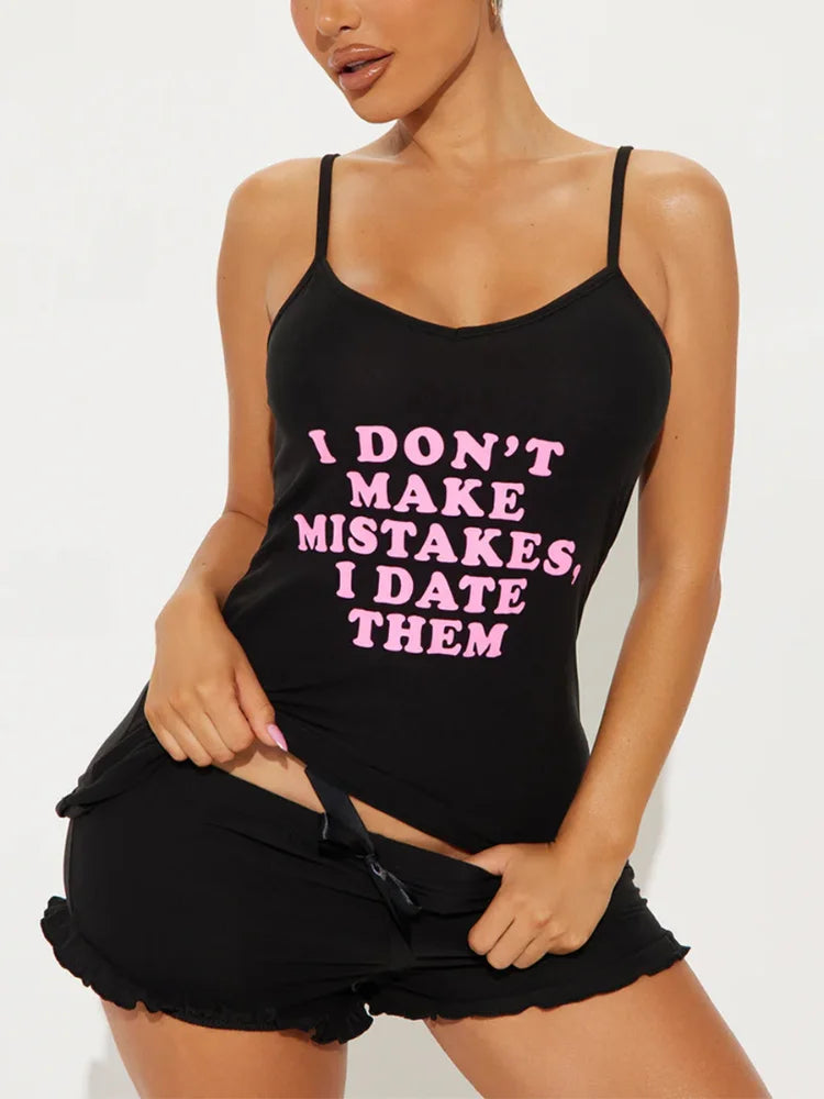 Letter Print Women Pajama Set Sleeveless O Neck Top & Elastic Waist Ruffle Trim Shorts Female 2 Pieces Sleepwear Nightwear