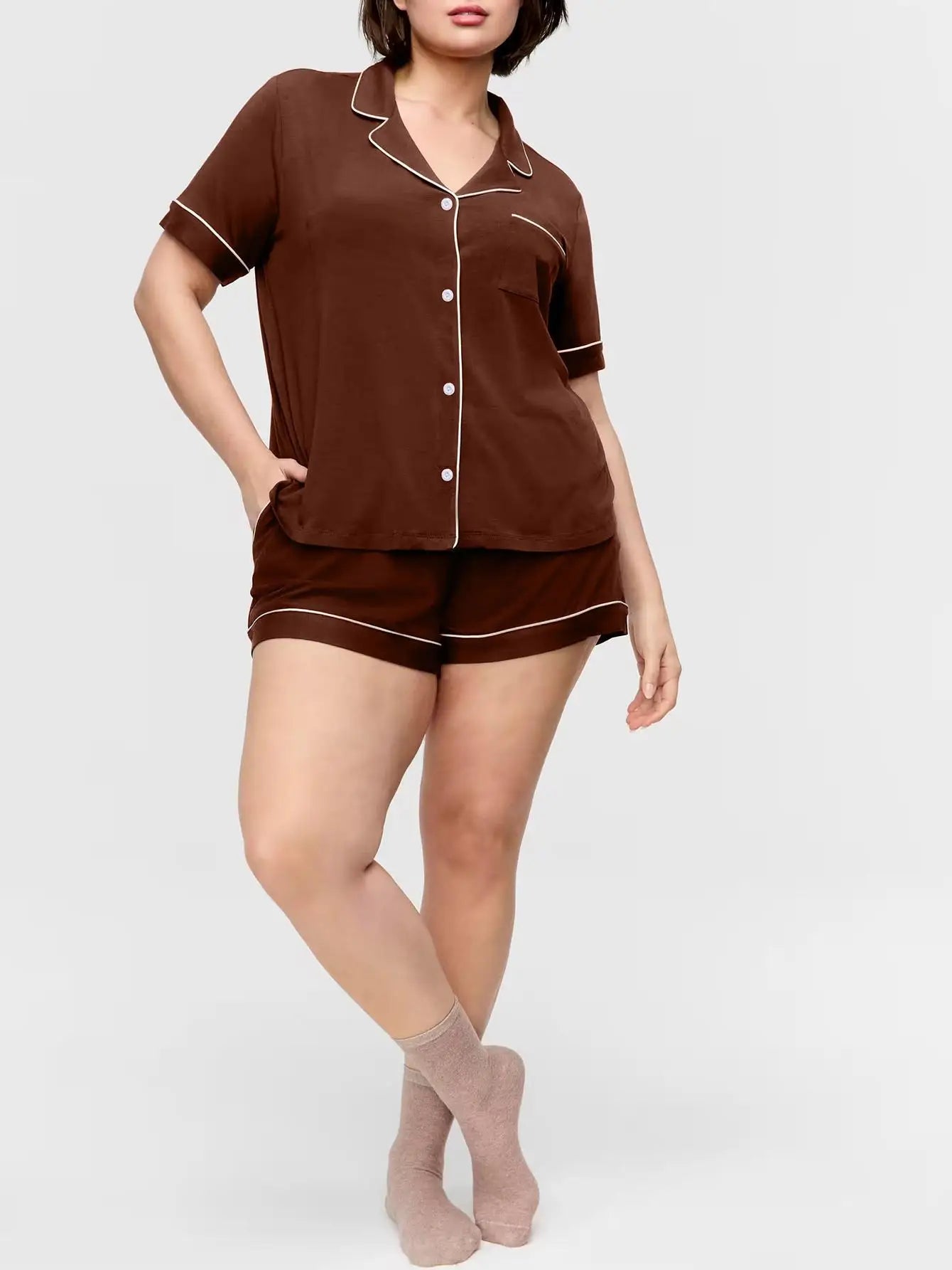 Plus Size Women Pajama Sets Short Sleeves Front Button Turn Down Collar Top & Shorts with Two Pockets Sleepwear Female Nightwear