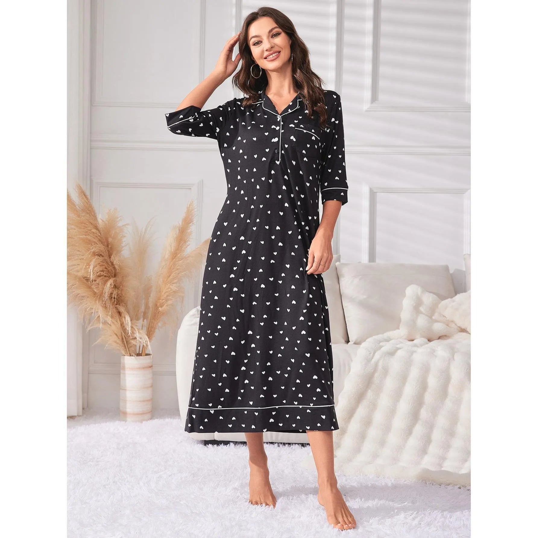Women Nightgown Notched Collar Female Sleepwear Dress with Chest Pocket Half Sleeve Fall Nightwear Front Button Homwear Clothing
